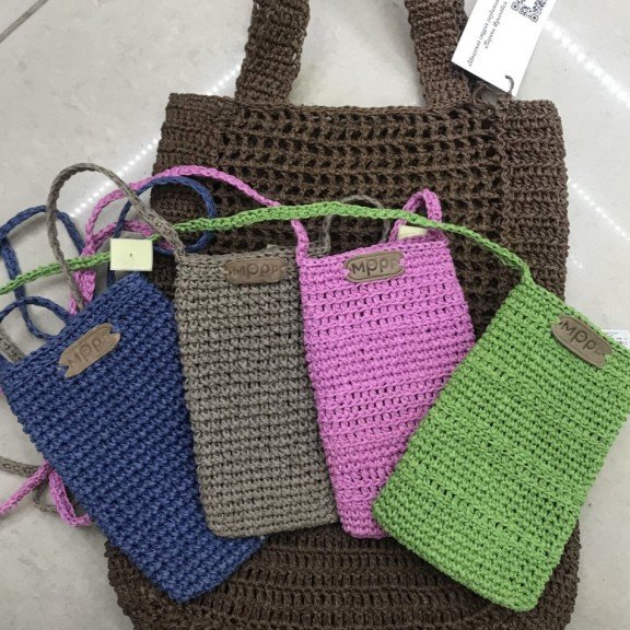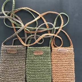 Маргарита вяжет из натуральной рафии аксессуары для телефонов, козырьки, сумки.