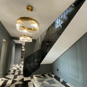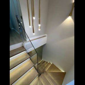 - Отделка лестниц ценными породами дерева (в комплексе со стеклянными ограждениями).