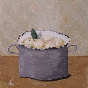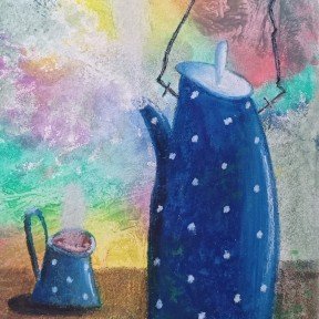 Каждая работа — это маленький мир, наполненный теплом и уютом, где простые вещи, такие как чайники, кастрюльки и кружки, становятся главными героями.