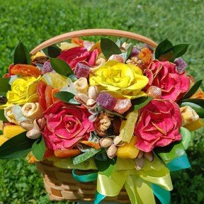 Фудфлористика - это составление композицией из ягод, фруктов, сухофруктов и другой еды. Мастер превращает яблоки в лепестки роз, собирая изящные букеты из сухофруктов и сладостей.